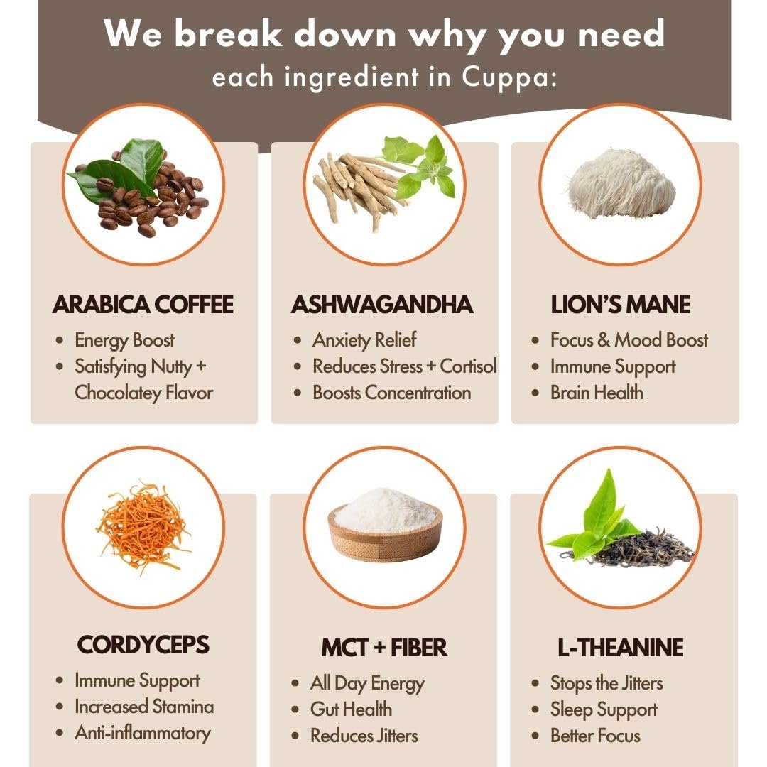 - BRAIN & MOOD BOOST: We’ve added KSM-66 Ashwagandha and Organic Lion’s Mane & Cordyceps for enhanced focus, great mood, sleep support, immune support, stress resillience and stamina. Our mushroom extracts are certified 100% organic fruiting bodies. They do not have any added starch, grain,or mycelium. Big day ahead? No problem when you’ve had your Cuppa in the morning!